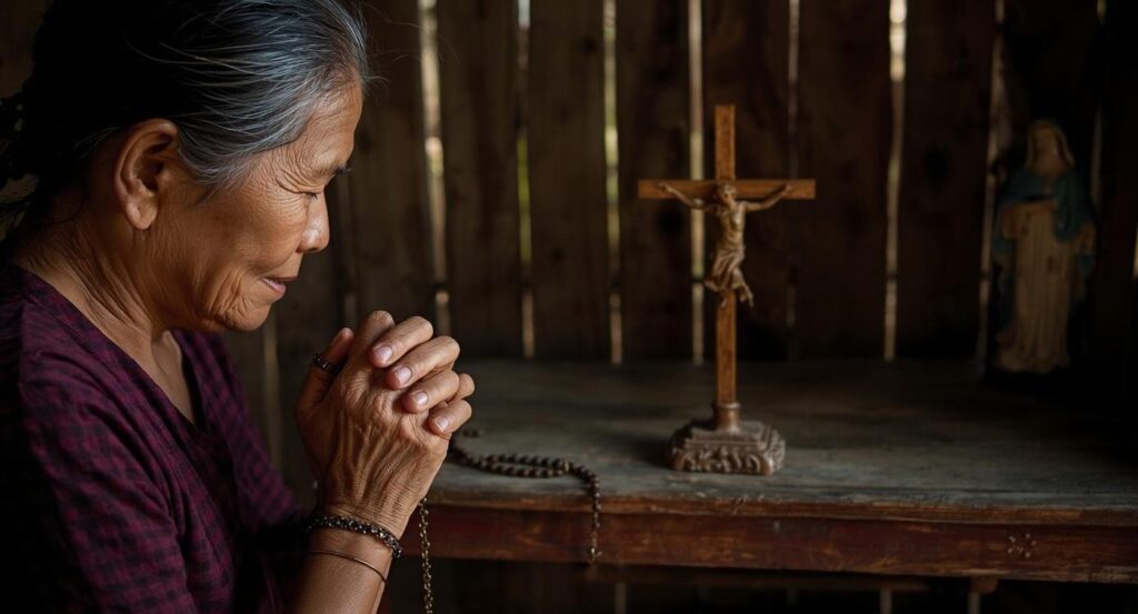 Ở một vùng quê yên bình miền Nam, giữa cánh đồng lúa xanh mướt, có căn nhà nhỏ lúc nào cũng vang tiếng kinh Mân Côi mỗi tối. Người ta quen với hình ảnh bà Bảy – dáng người gầy, khuôn mặt rám nắng – ngồi bên bàn thờ Đức Mẹ, tay cầm tràng chuỗi cũ, miệng khẽ đọc: “Kính mừng Maria đầy ơn phúc…”