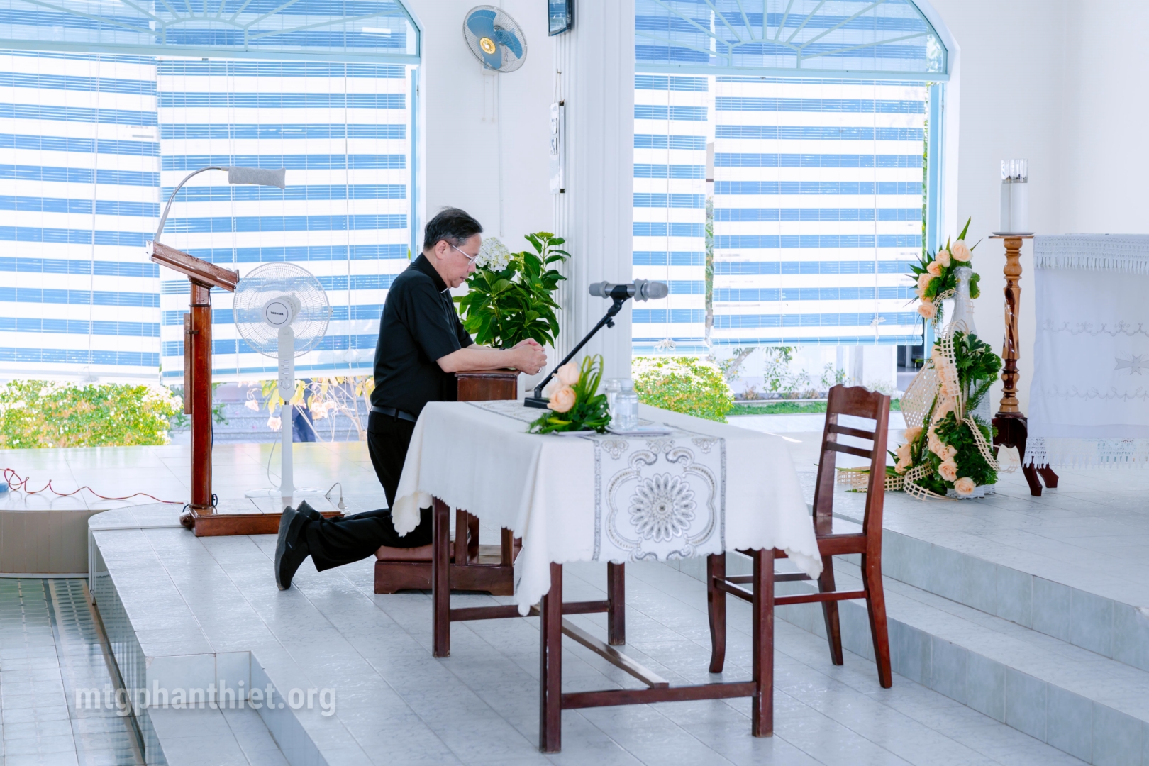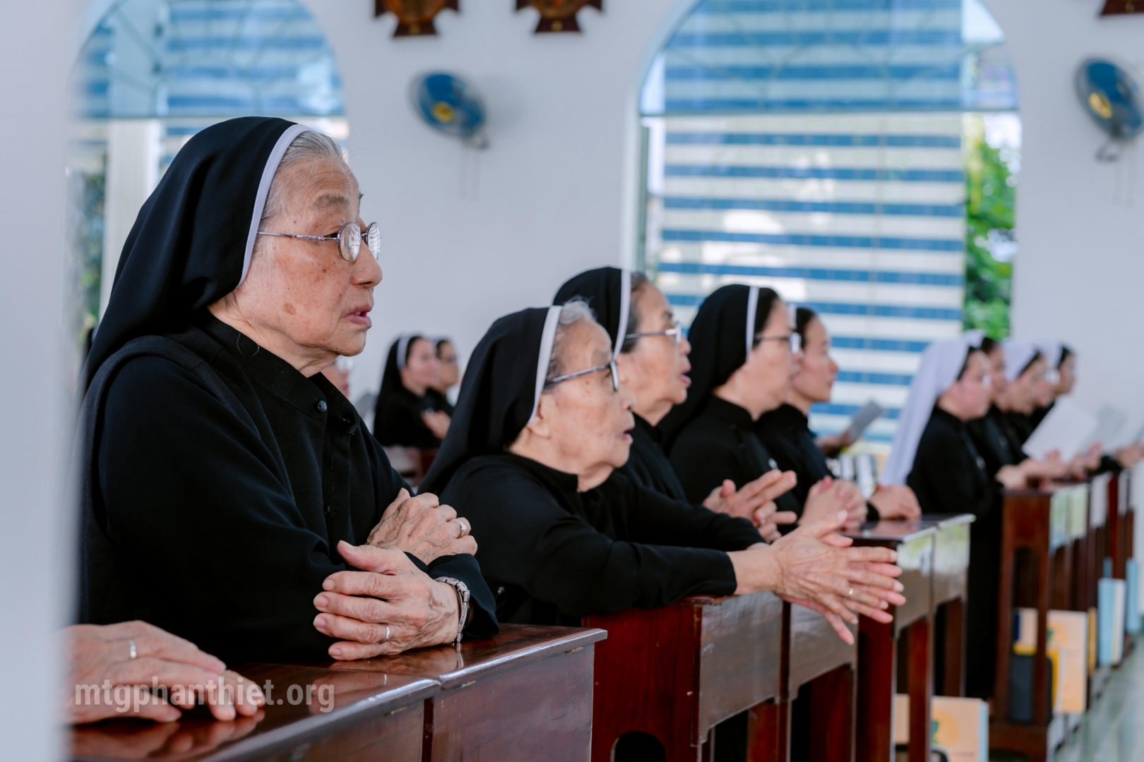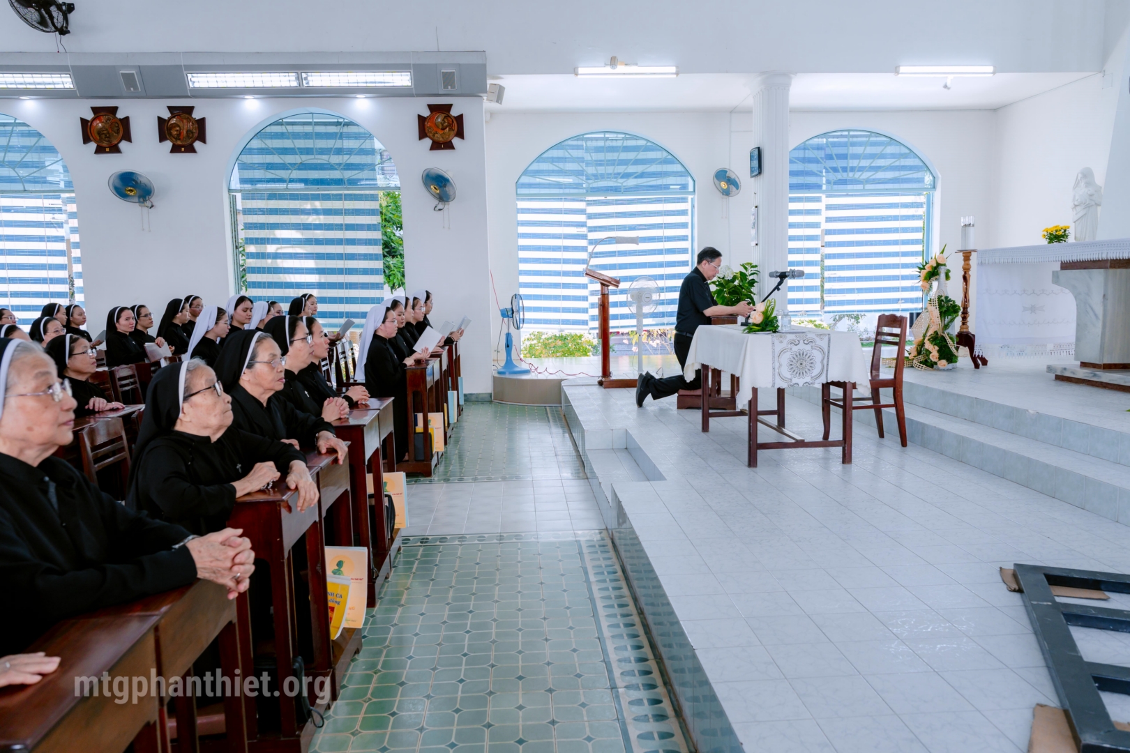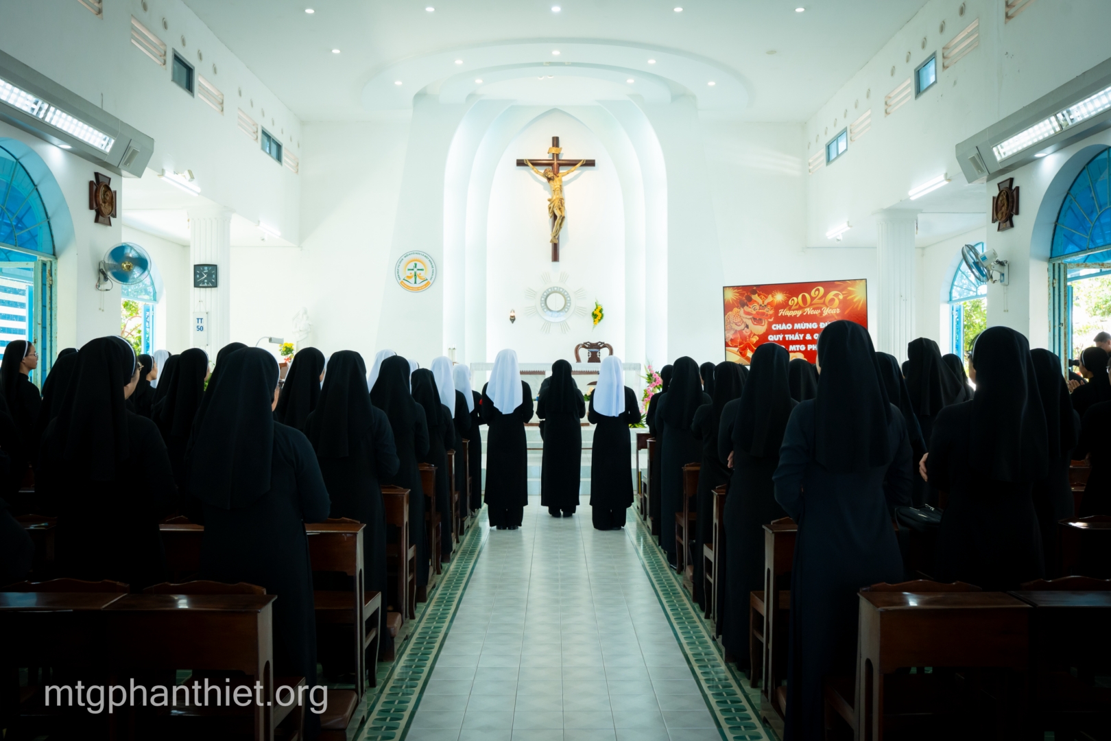 Sau phần chào đón, Đức cha cùng toàn thể chị em tiến vào nguyện đường. Trong không gian thánh thiêng, cộng đoàn quỳ gối, sốt sắng hiệp lời ca suy tôn Thánh Thể, âm thầm dâng lên Thiên Chúa tâm tình tạ ơn vì muôn ơn lành đã lãnh nhận trong năm qua, đồng thời phó thác năm mới cho tình yêu quan phòng của Chúa.