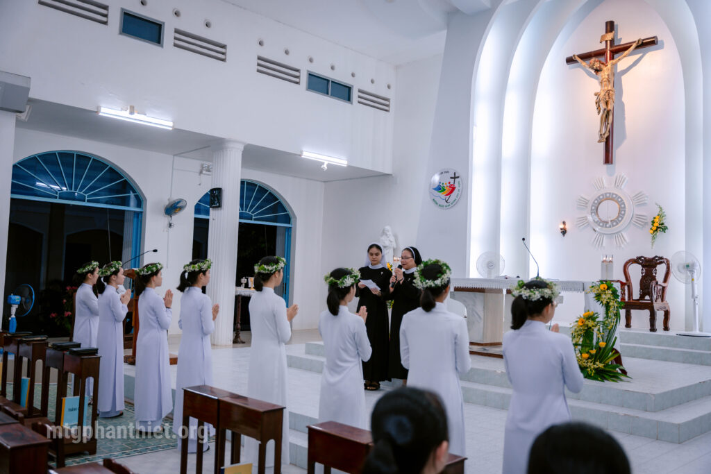 “Kính thưa Chị Tổng Phụ Trách, chúng em xin được nhận vào Thanh Tuyển viện Hội dòng Mến Thánh Giá Phan Thiết!”. Đó là lời đáp của 8 em dự tu sau thời gian tìm hiểu, cầu nguyện và phân định ơn gọi – được chính thức gia nhập Thanh Tuyển viện vào sáng ngày Chúa Nhật, ngày 5.10.2025, tại nguyện đường Hội dòng Mến Thánh Giá Phan Thiết. Lời thưa ấy đã vang lên như lời “xin vâng” của những tâm hồn trẻ trung trước tiếng gọi của Đức Kitô Chịu-Đóng-Đinh.