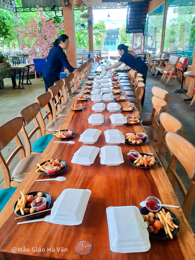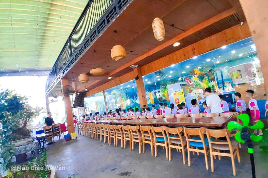 Trong không gian thoáng đãng, các bé thỏa thích vui chơi, chạy nhảy và tham gia các hoạt động ngoài trời. Những món ăn quen thuộc cho bữa trưa như khoai tây chiên, xúc xích, cá viên chiên… khiến các em vô cùng thích thú. Có bé vừa ăn vừa vui vẻ nói:“Hôm nay con được ăn nhiều món con thích!”, bé khác lại hào hứng khoe: “Con đi chơi với các bạn vui ơi là vui!”.
