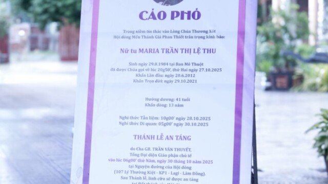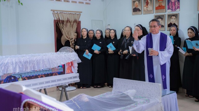 Trong niềm tin vào Đức Kitô Phục Sinh và phó thác trong Lòng Thương Xót Chúa, Hội dòng Mến Thánh Giá Phan Thiết đã cử hành nghi thức tẫn liệm Nữ tu Maria Trần Thị Lệ Thu – người chị em hiền lành, khiêm tốn và trung tín trong ơn gọi Mến Thánh Giá cho đến giây phút cuối cùng.