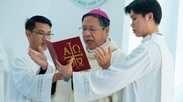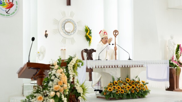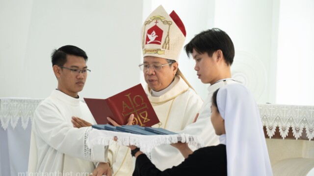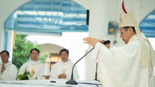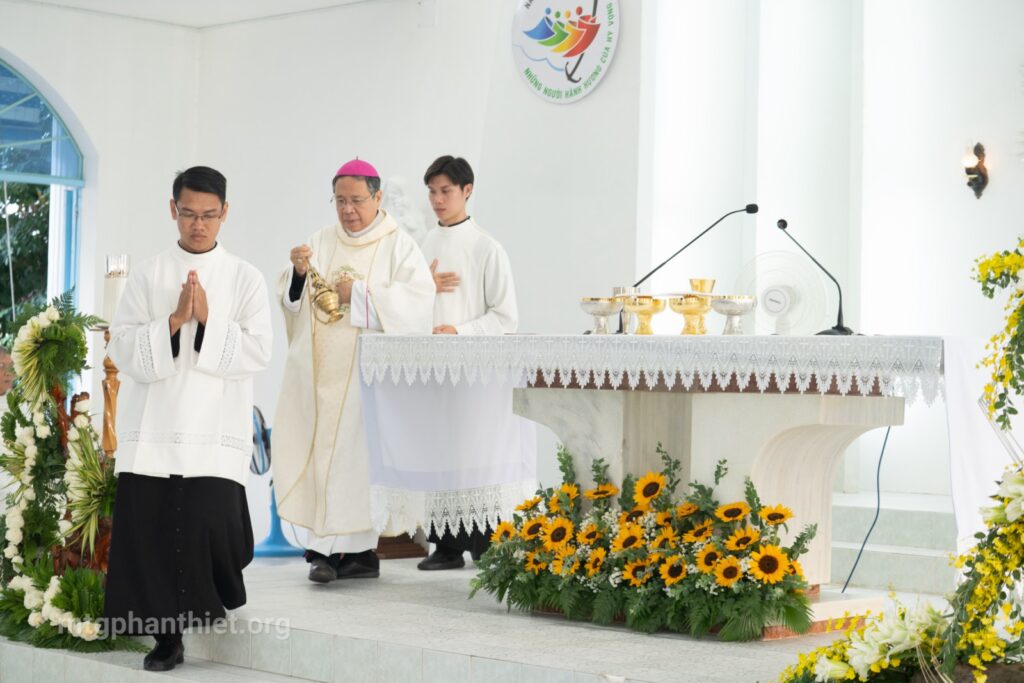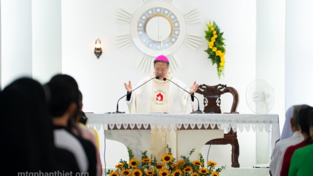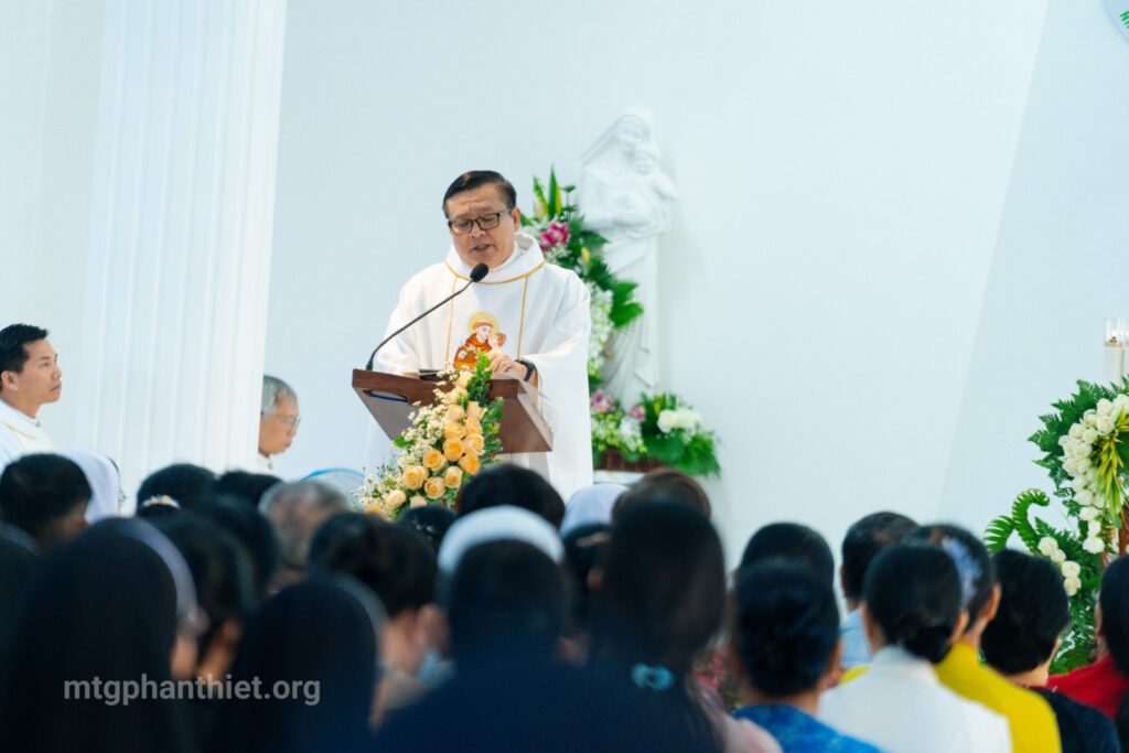 Mở đầu Thánh lễ, Đức cha Giuse thân tình chia sẻ: “Giữa niềm vui của lễ trọng này, Giáo phận chúng ta và Hội dòng Mến Thánh Giá Phan Thiết được lãnh nhận một hồng ân đặc biệt… Chúng ta tạ ơn Thiên Chúa vì muôn ơn lành Người thương ban trên Hội dòng, đặc biệt là hồng ân ơn gọi mà Chúa đã gieo vào tâm hồn các chị em hôm nay. Xin Chúa Thánh Thần đổ tràn niềm vui, sự kiên vững và lòng trung tín trên các tân khấn sinh, để các chị luôn tìm thấy hạnh phúc trong đời sống dâng hiến, và mỗi ngày trở nên dấu chỉ của tình yêu Chúa giữa lòng thế giới.”