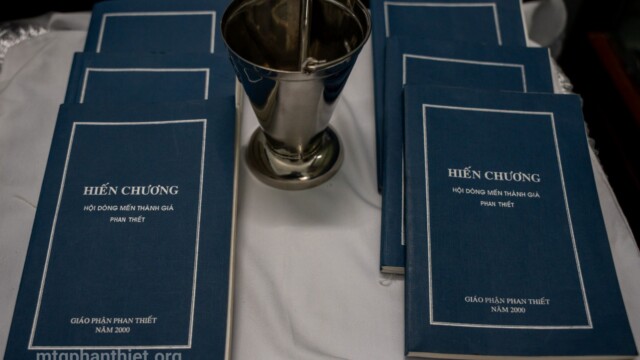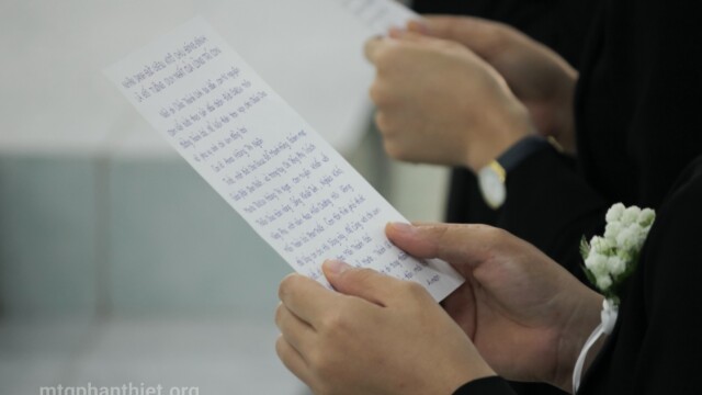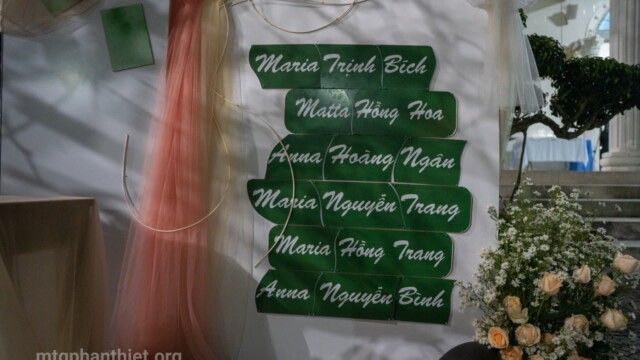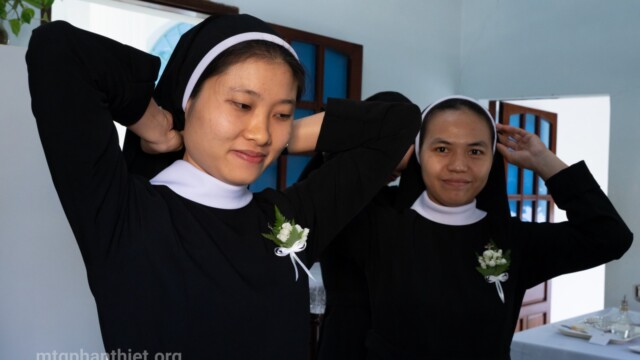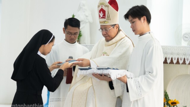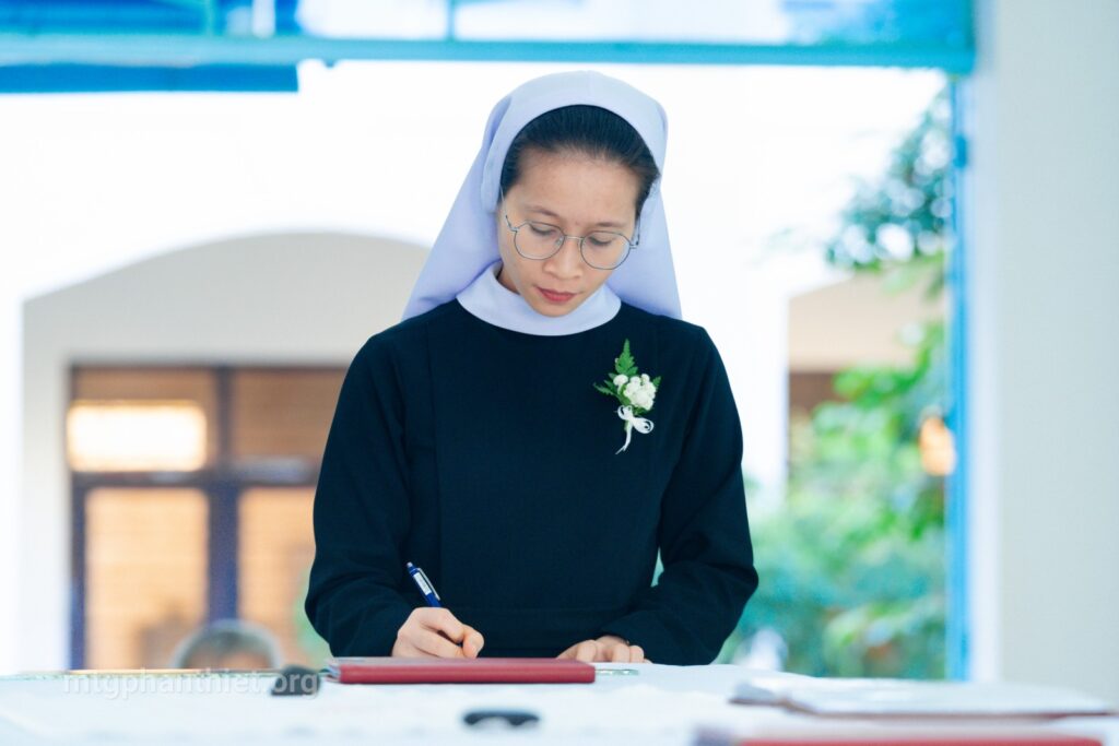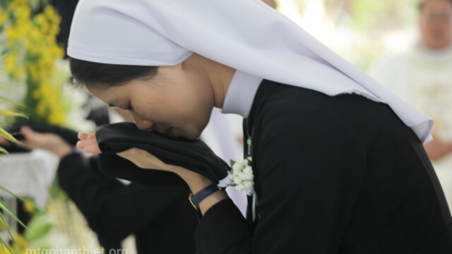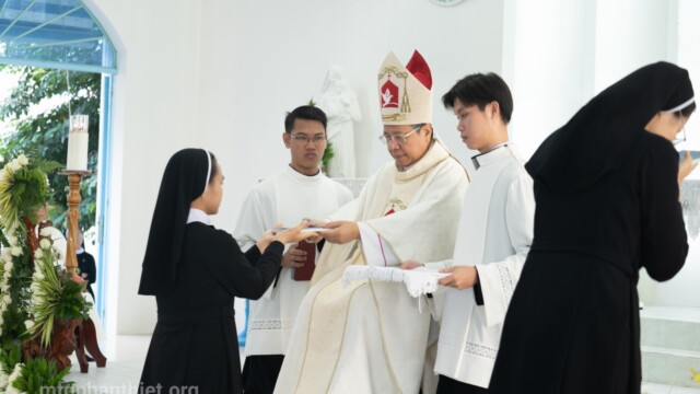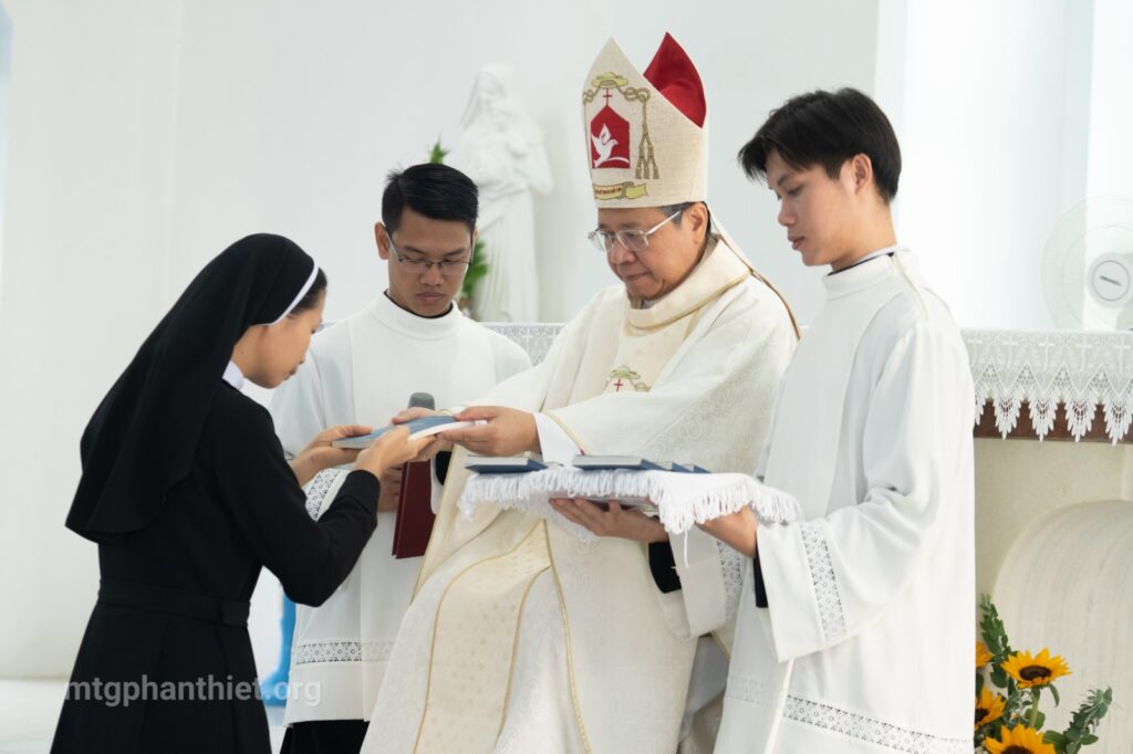 Đức cha Giuse trao khăn lúp đen và bản Hiến chương Hội dòng – dấu chỉ các chị hoàn toàn thuộc về Thiên Chúa qua Hội dòng Mến Thánh Giá Phan Thiết. Từ nay, các chị được mời gọi chuyên chăm chiêm ngắm Đức Giêsu Chịu Đóng Đinh, đối tượng duy nhất của lòng trí mình.