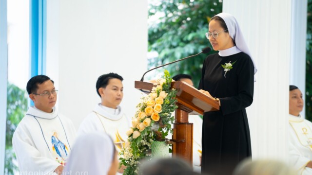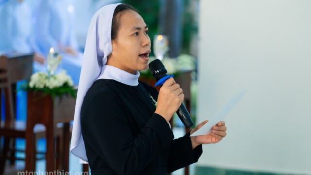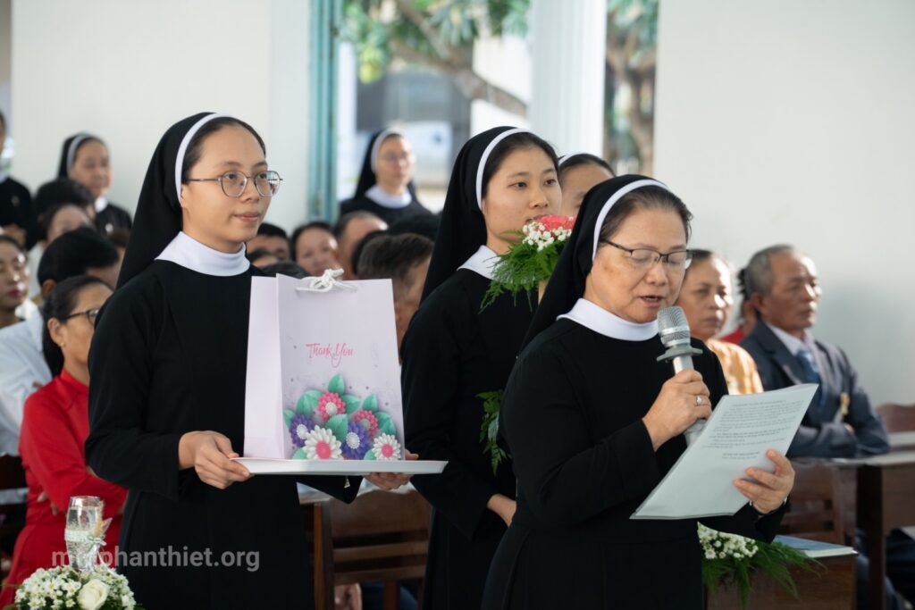 Sau lời nguyện Hiệp lễ, Sơ Tổng Phụ trách Maria Têrêsa Hoàng Thị Ngọc thay lời Hội dòng bày tỏ tâm tình tri ân đến Đức cha, quý Cha, thân nhân các tân khấn sinh và toàn thể cộng đoàn.