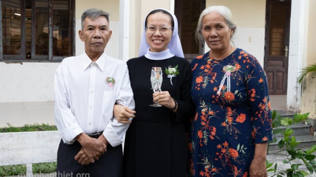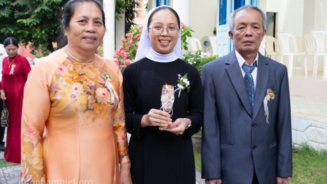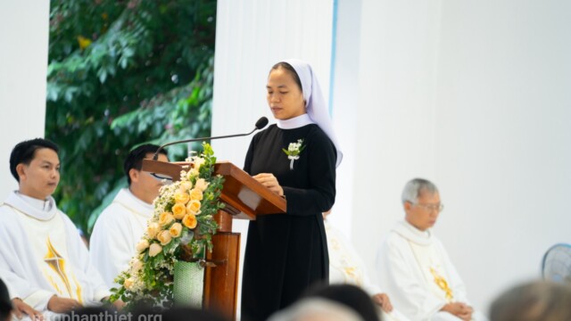 Trong bài giảng lễ, Cha Antôn Lê Minh Tuấn – Quản hạt Hàm Tân, chia sẻ những tâm tình sâu sắc về giá trị đời tận hiến. Cha nói: “Lời khấn chính là lời cam kết trung thành với Thiên Chúa, với Giáo hội và với con người. Vì thế, có thể nói được rằng, ‘lời Khấn’ hay ‘những lời khuyên Phúc Âm’ đúng là những ‘gia bảo’ của Hội Thánh, những ‘kho tàng’ quý giá giúp Hội Thánh luôn giữ được nét trẻ trung và vẻ đẹp thần linh mà không một cơ cấu hay tổ chức trần thế nào có thể có được”. Những lời nhắn nhủ tâm tình và lắng đọng của cha đã giúp cộng đoàn thêm xác tín rằng: đời sống thánh hiến là hồng ân, nhưng cũng là sứ mạng, là nơi vẻ đẹp của Tin Mừng được tỏa sáng giữa lòng nhân loại.