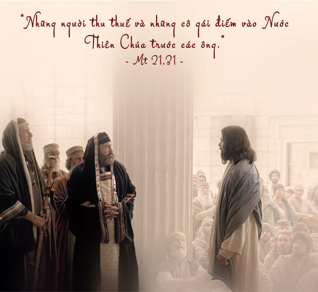 Chúa Giêsu hỏi cử tọa: “Trong hai người con, ai là người thi hành ý cha?” Rõ ràng là hạng người thứ nhất! Chúa Giêsu kết luận: “Hạng người tội lỗi, thu thuế và gái điếm, sẽ vào Nước Trời, vì họ đã tin ông Gioan và sám hối”.