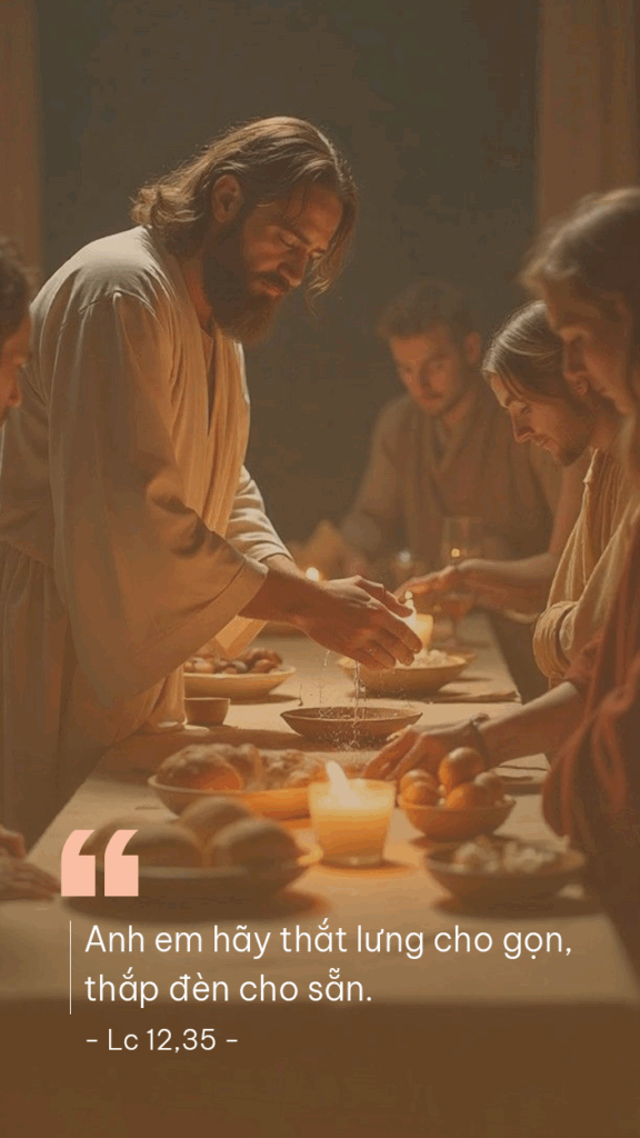 35“Anh em hãy thắt lưng cho gọn, thắp đèn cho sẵn. 36Hãy làm như những người đợi chủ đi ăn cưới về, để khi chủ vừa về tới và gõ cửa, là mở ngay. 37Khi chủ về mà thấy những đầy tớ ấy đang tỉnh thức, thì thật là phúc cho họ. Thầy bảo thật anh em : Chủ sẽ thắt lưng, đưa họ vào bàn ăn, và đến bên từng người mà phục vụ. 38Nếu canh hai hoặc canh ba ông chủ mới về, mà còn thấy họ tỉnh thức như vậy, thì thật là phúc cho họ.