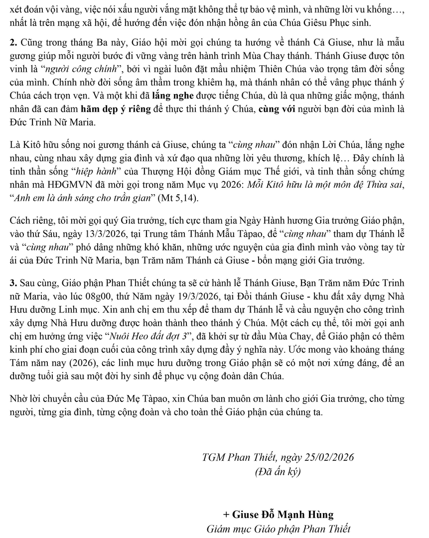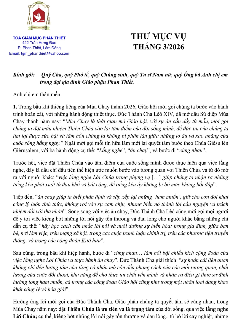 Thư Mục Vụ Tháng 03 Năm 2026 – Giáo Phận Phan Thiết