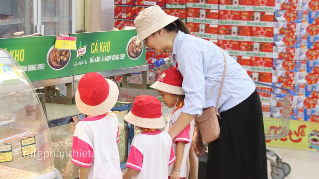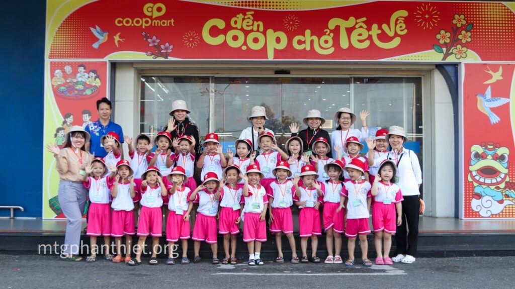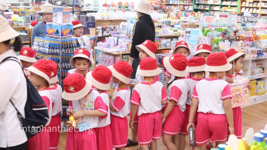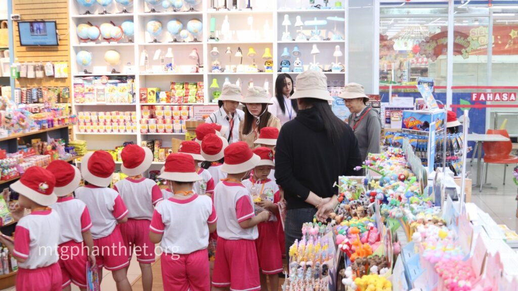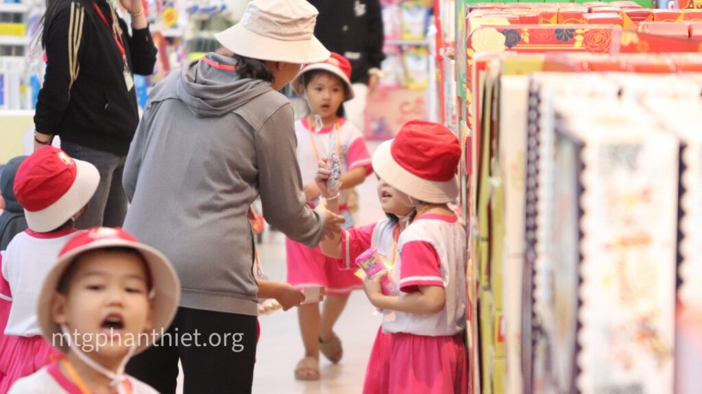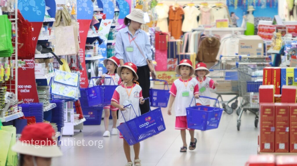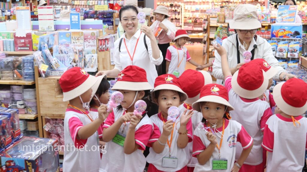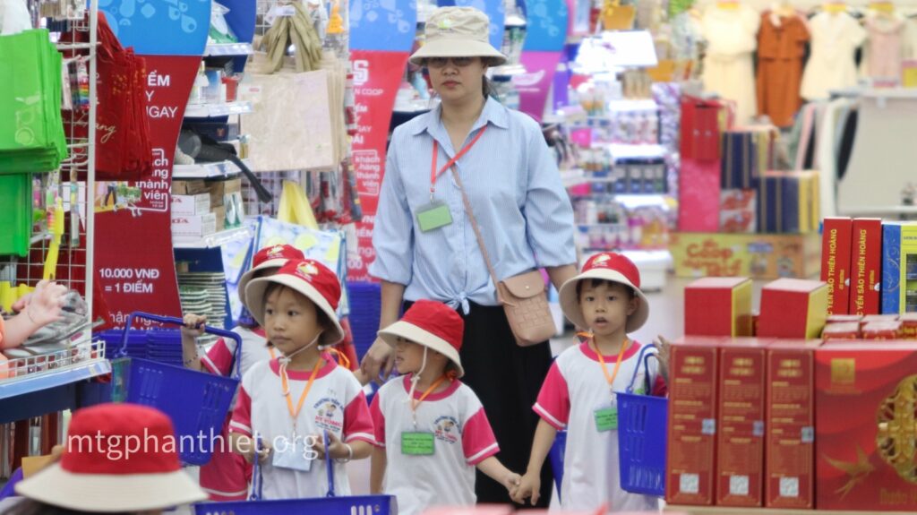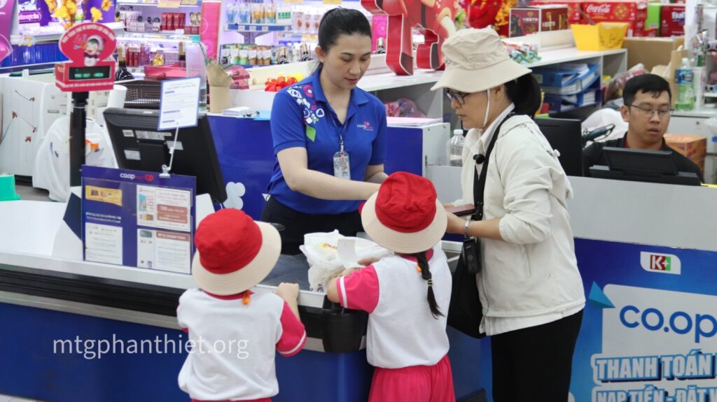 Tại siêu thị Co.opmart La Gi, các bé lớp Lá Trường Mầm Non Hy Vọng – thuộc Cộng đoàn Tân Lập Hội dòng Mến Thánh Giá Phan Thiết – được chia nhóm để lần lượt tham quan nhà sách, quầy hàng, những kệ đồ quen thuộc trong đời sống hằng ngày. Trước đó, các cô đã cùng các em ngồi lại, trò chuyện xem “hôm nay con muốn mua gì?”. Có bé hào hứng nói muốn mua bánh, mua đồ chơi, mua bút màu, có bé lại bảo thích mua xì dầu vì rất mê ăn xì dầu với cơm… Những dự định nhỏ bé ấy đều được lắng nghe và trân trọng.
