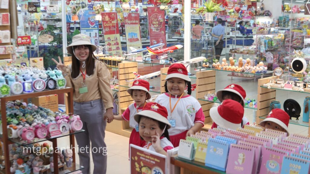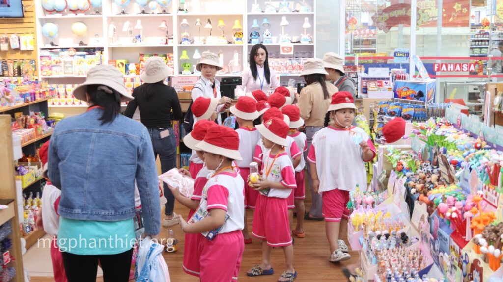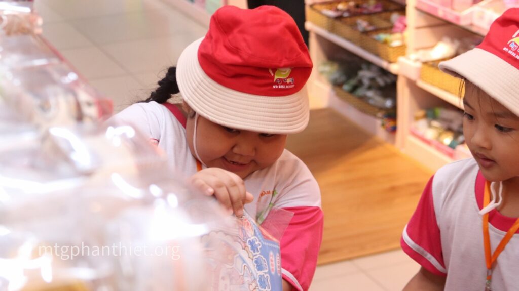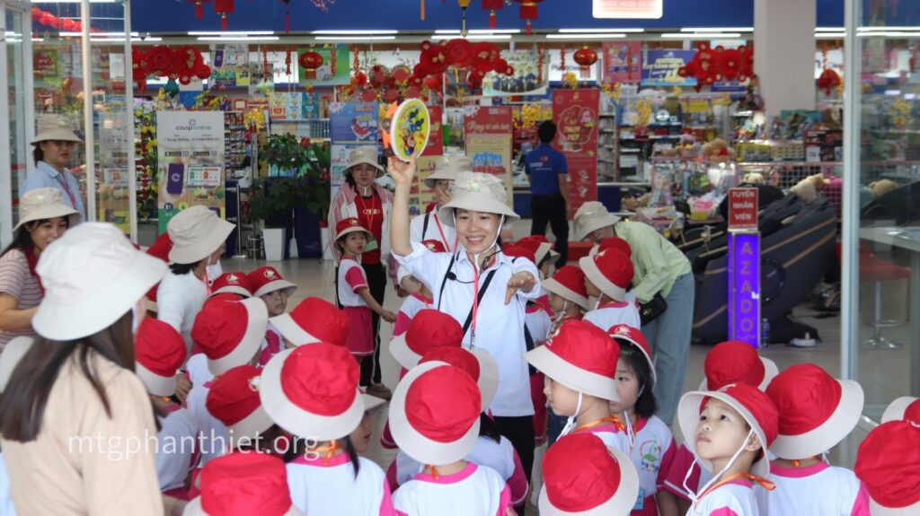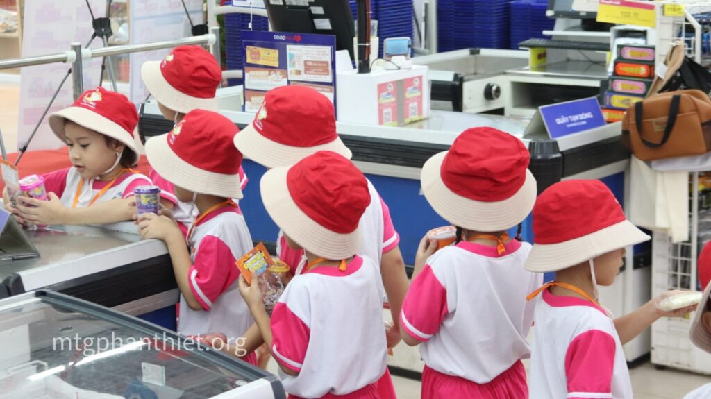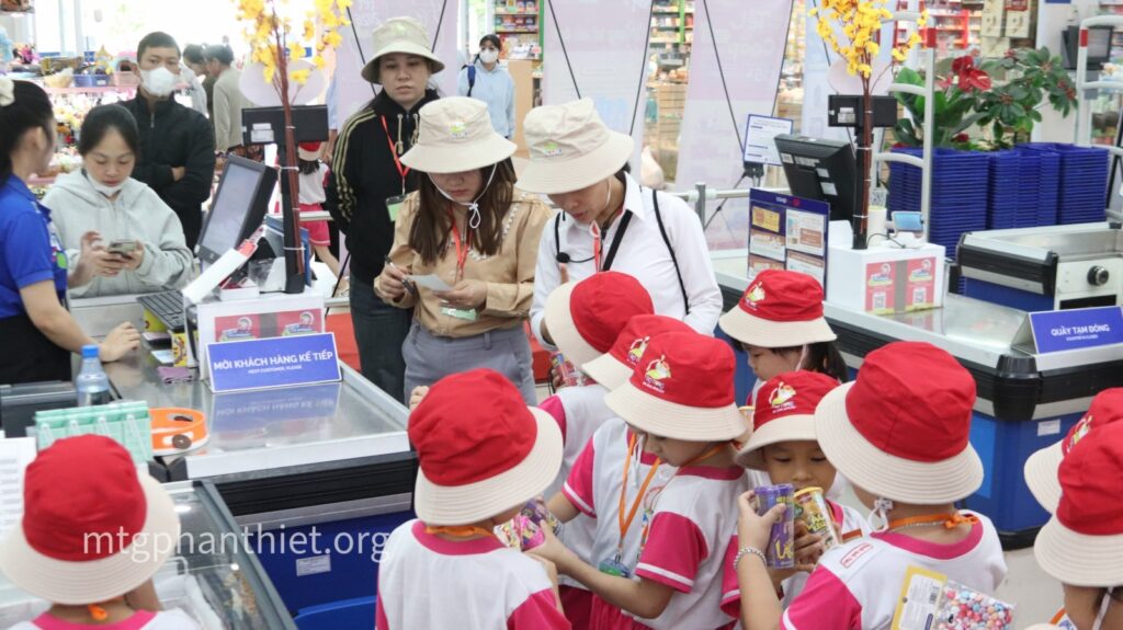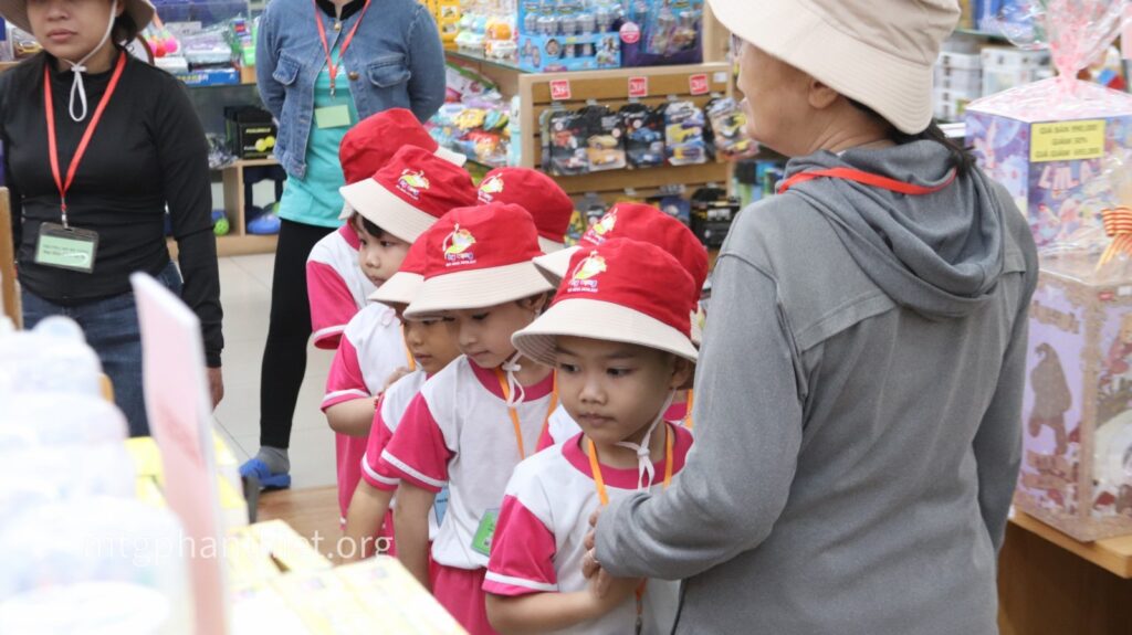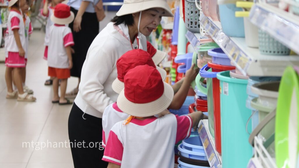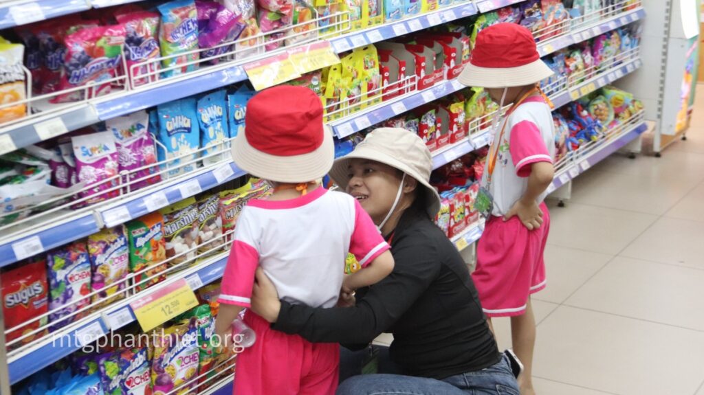 Tại siêu thị Co.opmart La Gi, các bé lớp Lá Trường Mầm Non Hy Vọng – thuộc Cộng đoàn Tân Lập Hội dòng Mến Thánh Giá Phan Thiết – được chia nhóm để lần lượt tham quan nhà sách, quầy hàng, những kệ đồ quen thuộc trong đời sống hằng ngày. Trước đó, các cô đã cùng các em ngồi lại, trò chuyện xem “hôm nay con muốn mua gì?”. Có bé hào hứng nói muốn mua bánh, mua đồ chơi, mua bút màu, có bé lại bảo thích mua xì dầu vì rất mê ăn xì dầu với cơm… Những dự định nhỏ bé ấy đều được lắng nghe và trân trọng.