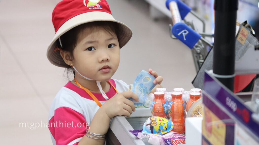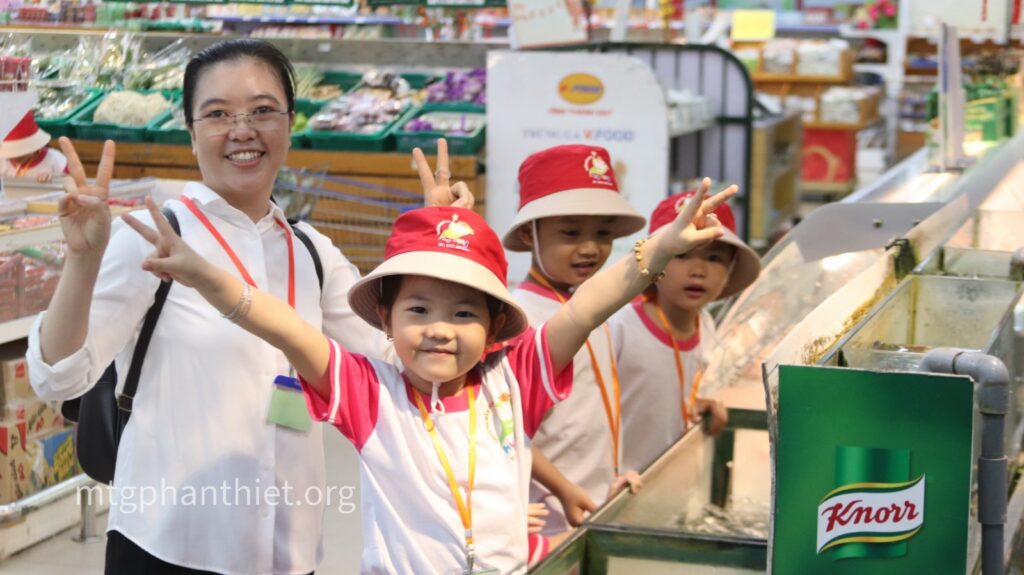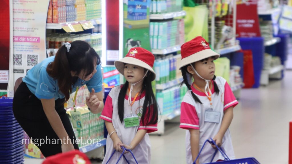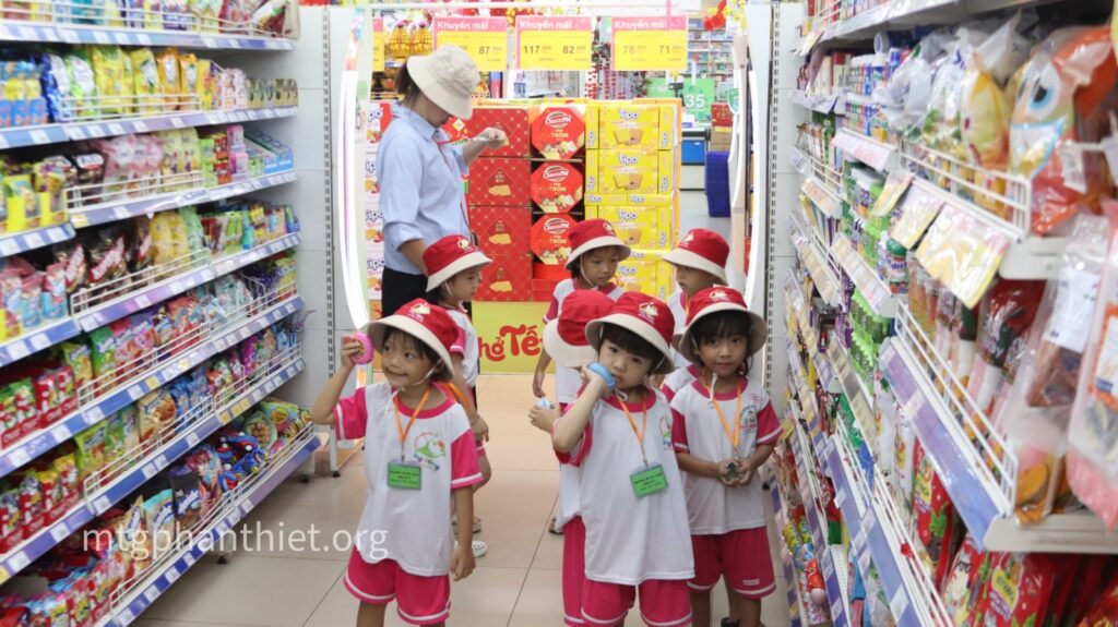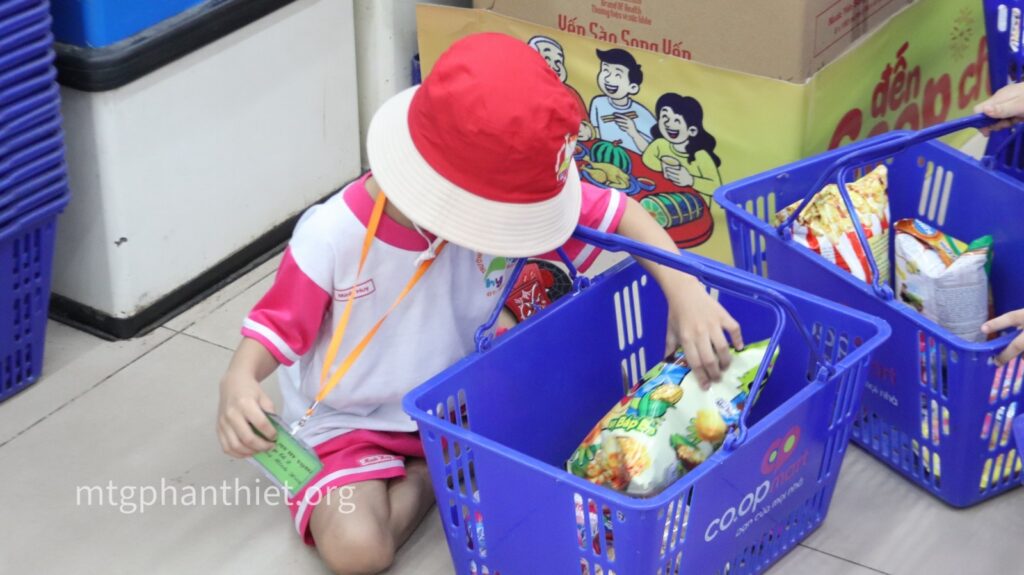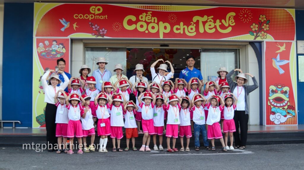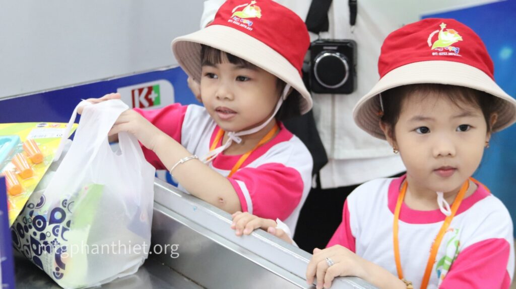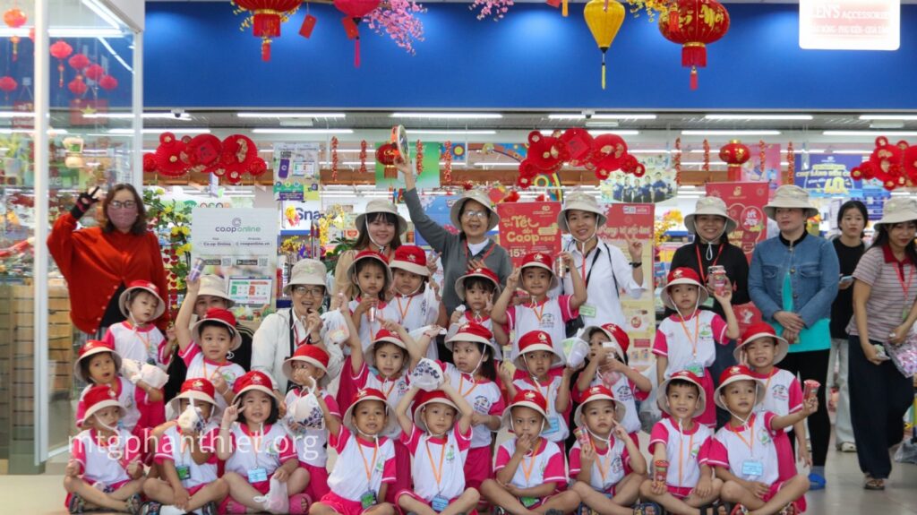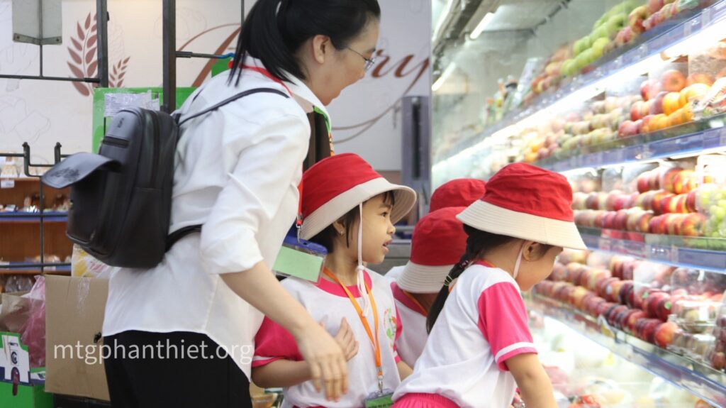 Tại siêu thị Co.opmart La Gi, các bé lớp Lá Trường Mầm Non Hy Vọng – thuộc Cộng đoàn Tân Lập Hội dòng Mến Thánh Giá Phan Thiết – được chia nhóm để lần lượt tham quan nhà sách, quầy hàng, những kệ đồ quen thuộc trong đời sống hằng ngày. Trước đó, các cô đã cùng các em ngồi lại, trò chuyện xem “hôm nay con muốn mua gì?”. Có bé hào hứng nói muốn mua bánh, mua đồ chơi, mua bút màu, có bé lại bảo thích mua xì dầu vì rất mê ăn xì dầu với cơm… Những dự định nhỏ bé ấy đều được lắng nghe và trân trọng.