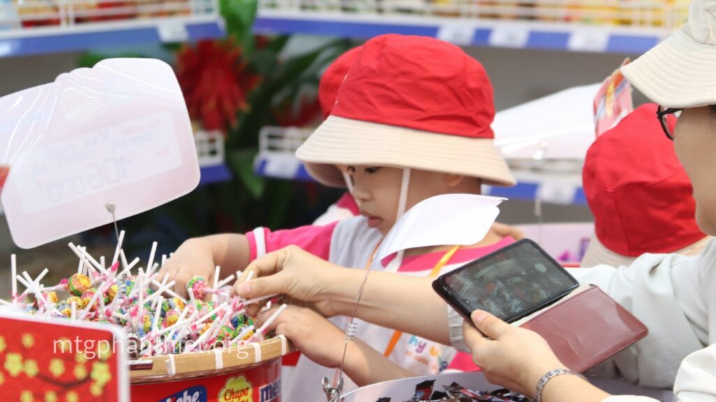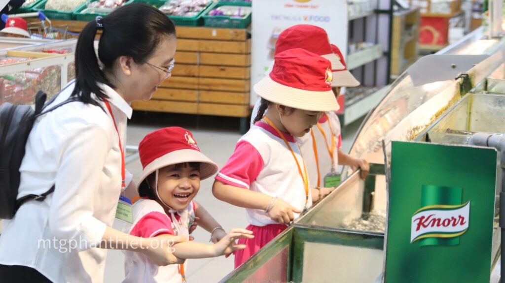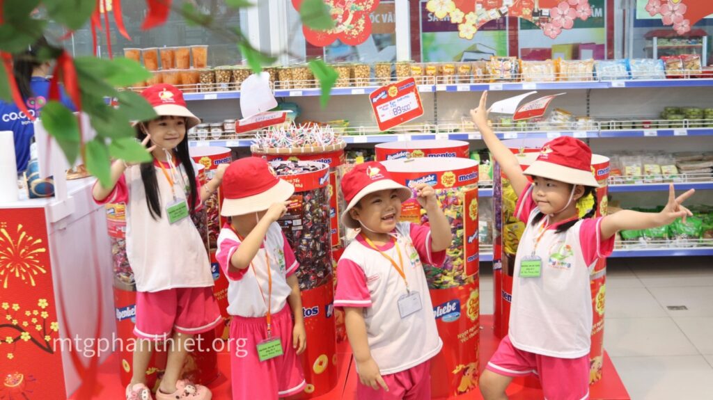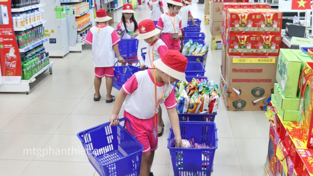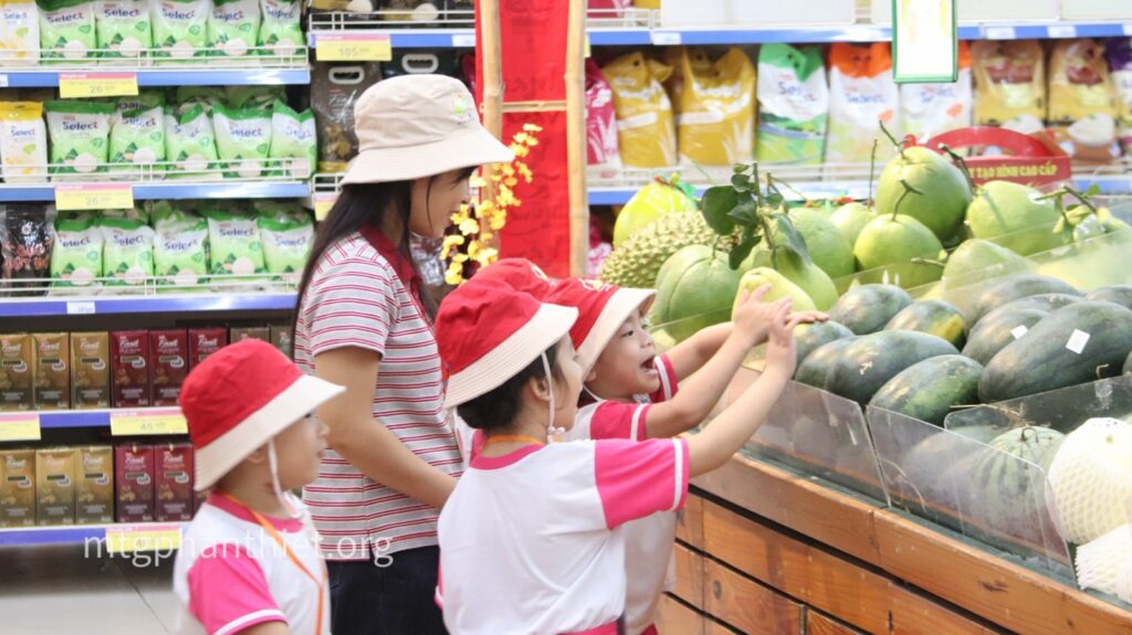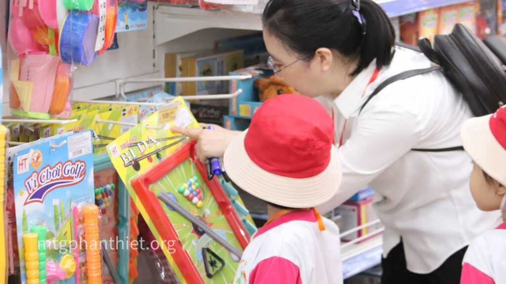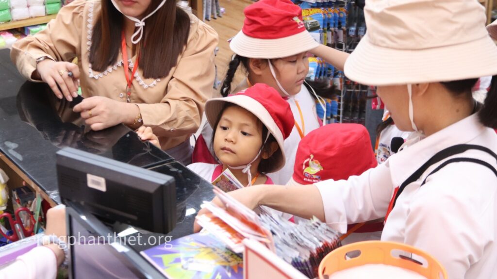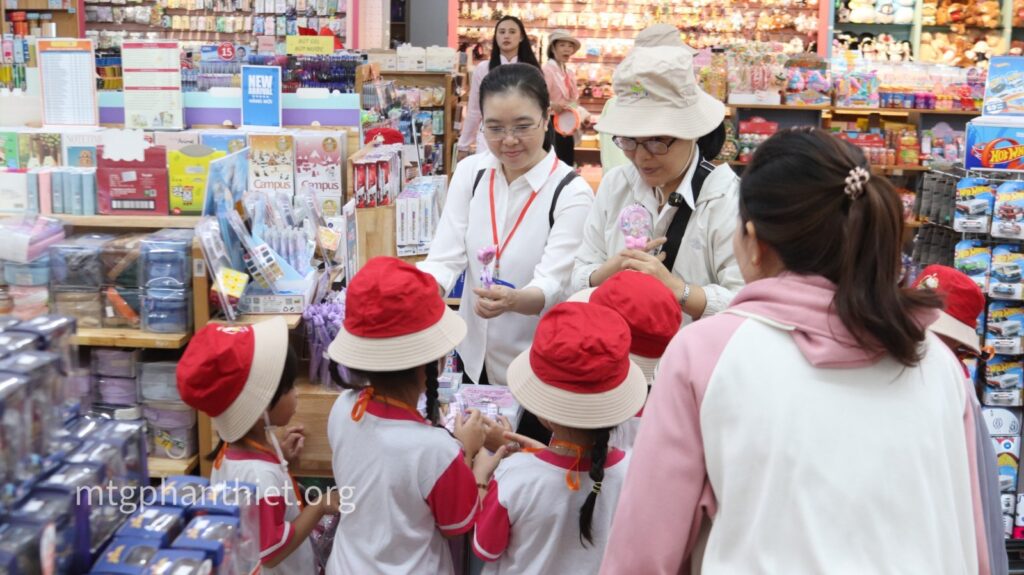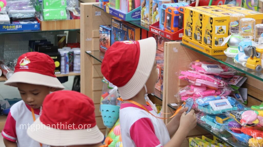 Tại siêu thị Co.opmart La Gi, các bé lớp Lá Trường Mầm Non Hy Vọng – thuộc Cộng đoàn Tân Lập Hội dòng Mến Thánh Giá Phan Thiết – được chia nhóm để lần lượt tham quan nhà sách, quầy hàng, những kệ đồ quen thuộc trong đời sống hằng ngày. Trước đó, các cô đã cùng các em ngồi lại, trò chuyện xem “hôm nay con muốn mua gì?”. Có bé hào hứng nói muốn mua bánh, mua đồ chơi, mua bút màu, có bé lại bảo thích mua xì dầu vì rất mê ăn xì dầu với cơm… Những dự định nhỏ bé ấy đều được lắng nghe và trân trọng.