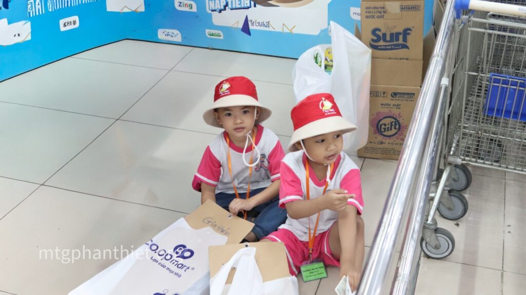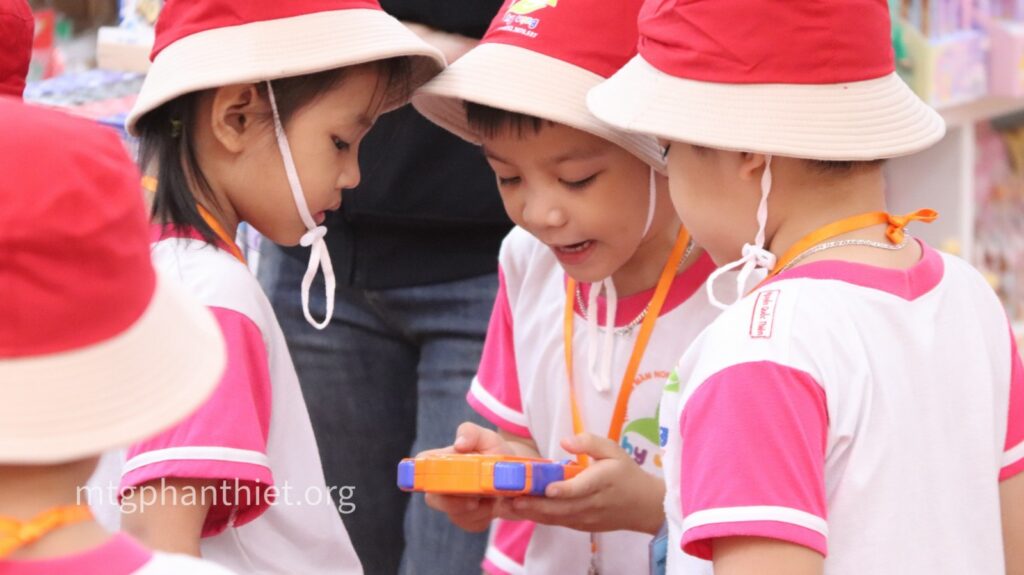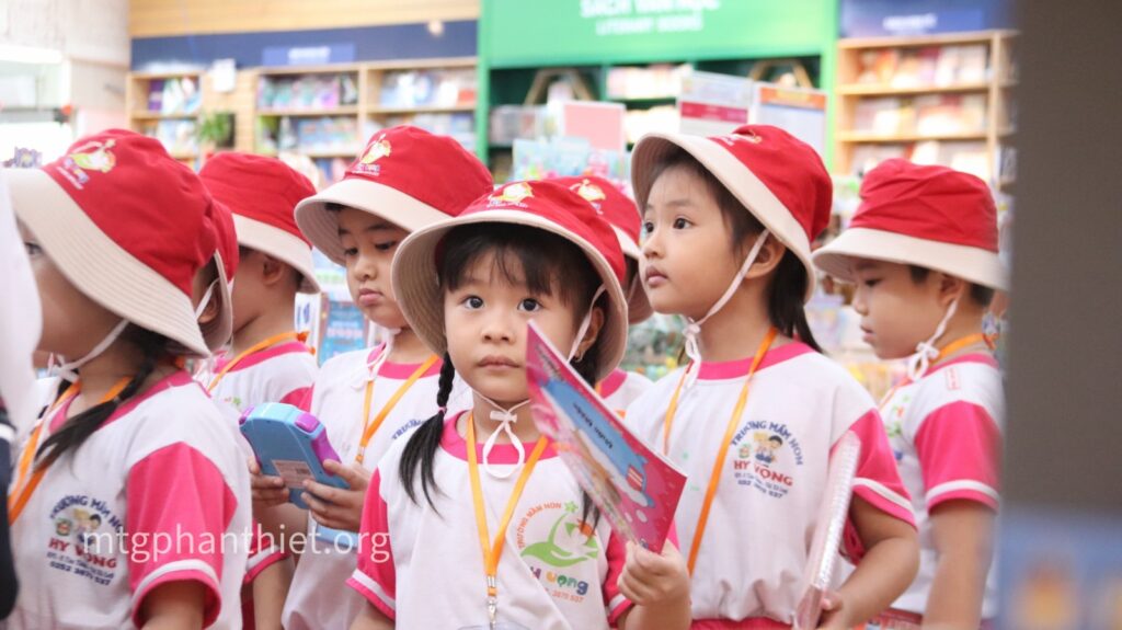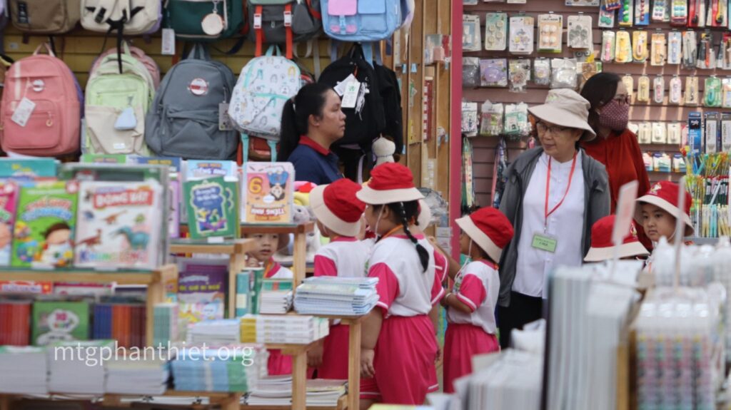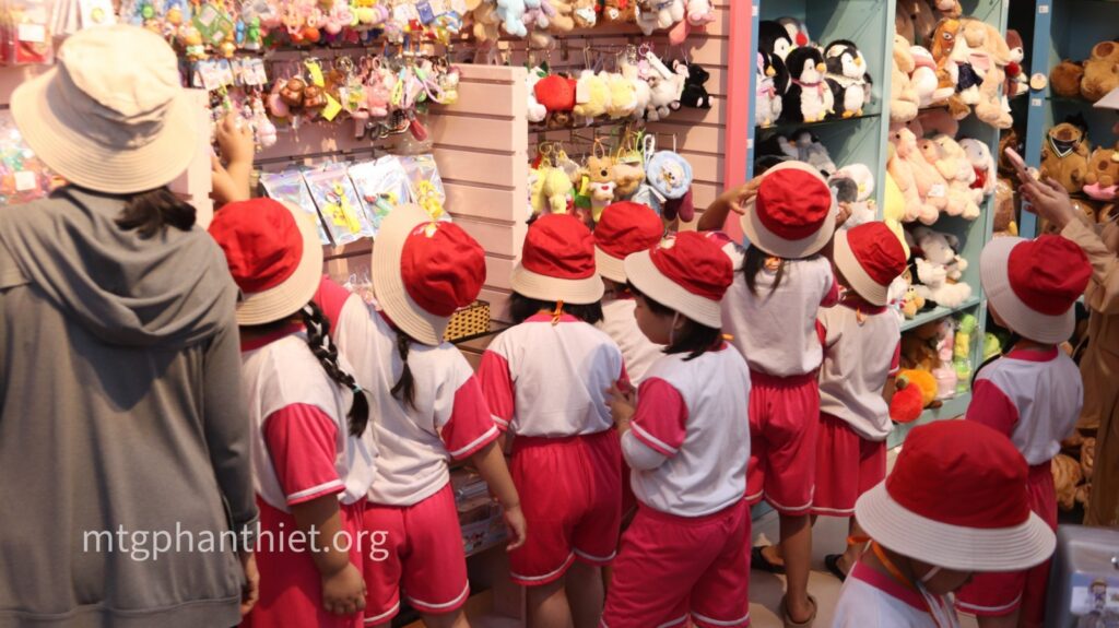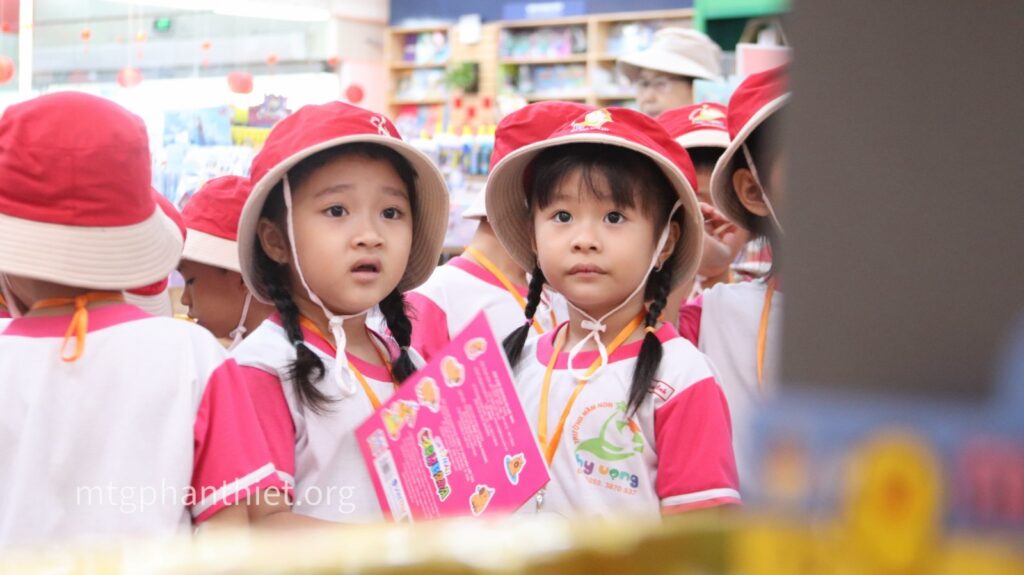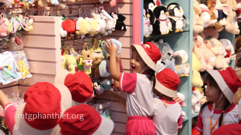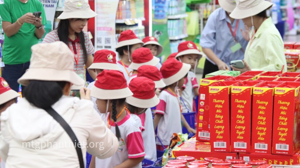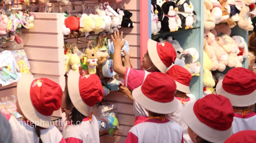 Tại siêu thị Co.opmart La Gi, các bé lớp Lá Trường Mầm Non Hy Vọng – thuộc Cộng đoàn Tân Lập Hội dòng Mến Thánh Giá Phan Thiết – được chia nhóm để lần lượt tham quan nhà sách, quầy hàng, những kệ đồ quen thuộc trong đời sống hằng ngày. Trước đó, các cô đã cùng các em ngồi lại, trò chuyện xem “hôm nay con muốn mua gì?”. Có bé hào hứng nói muốn mua bánh, mua đồ chơi, mua bút màu, có bé lại bảo thích mua xì dầu vì rất mê ăn xì dầu với cơm… Những dự định nhỏ bé ấy đều được lắng nghe và trân trọng.