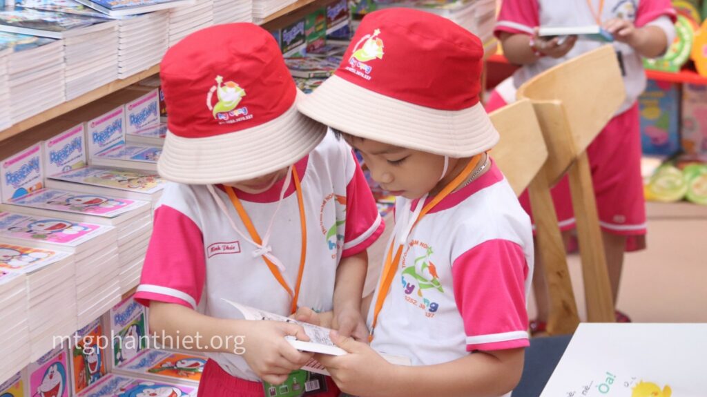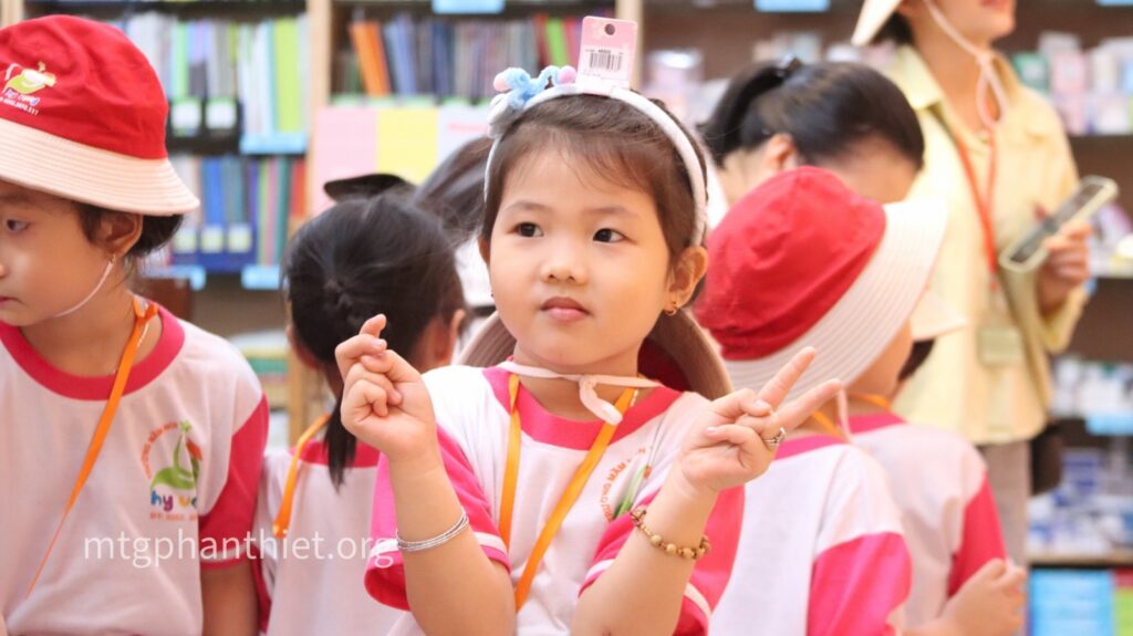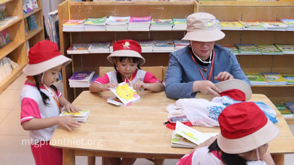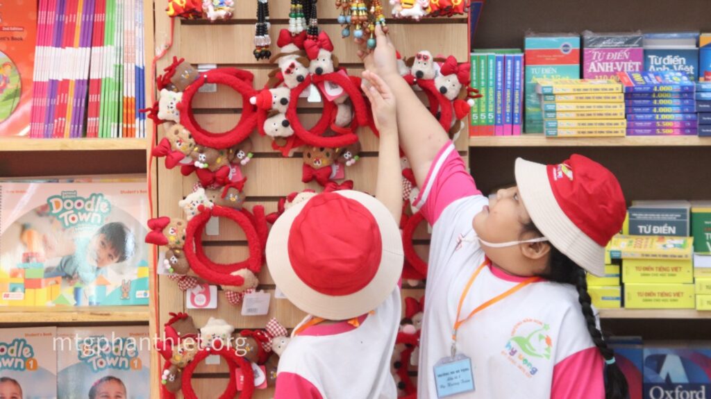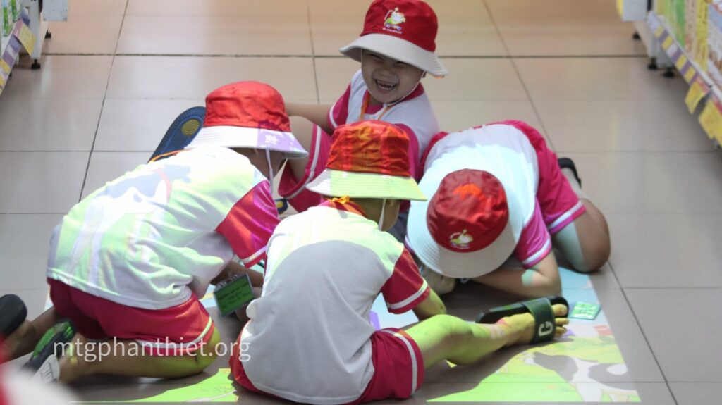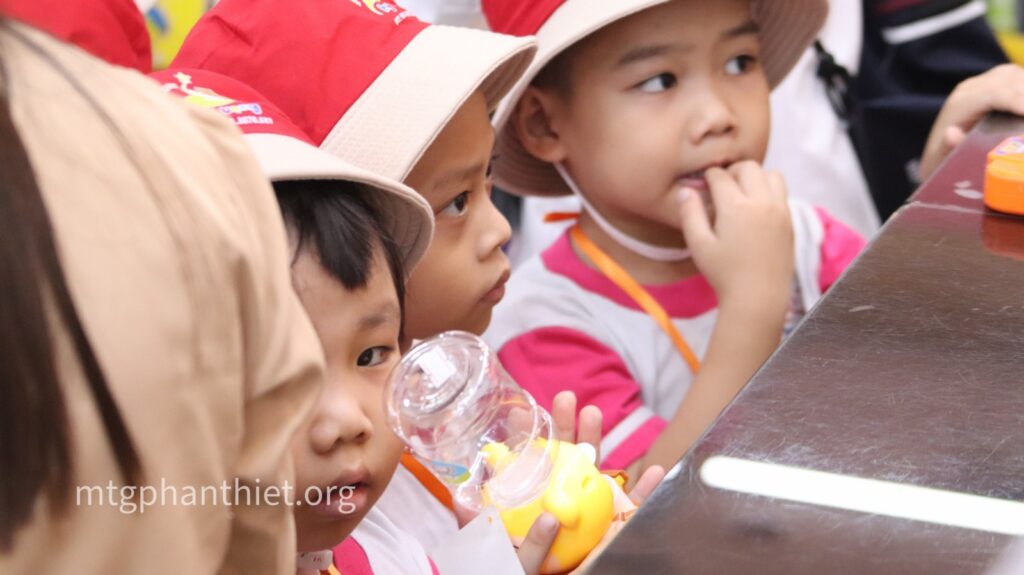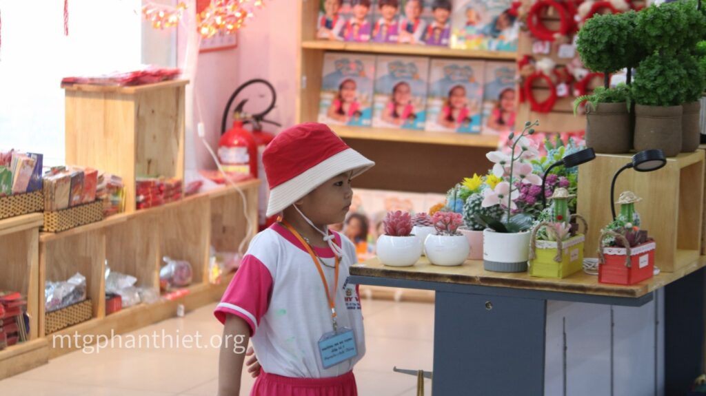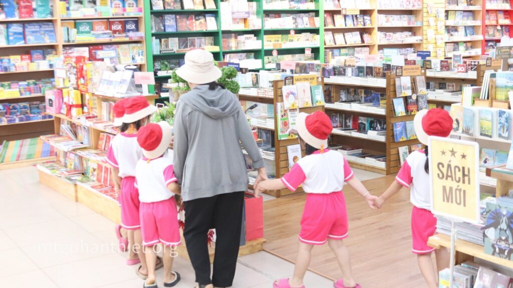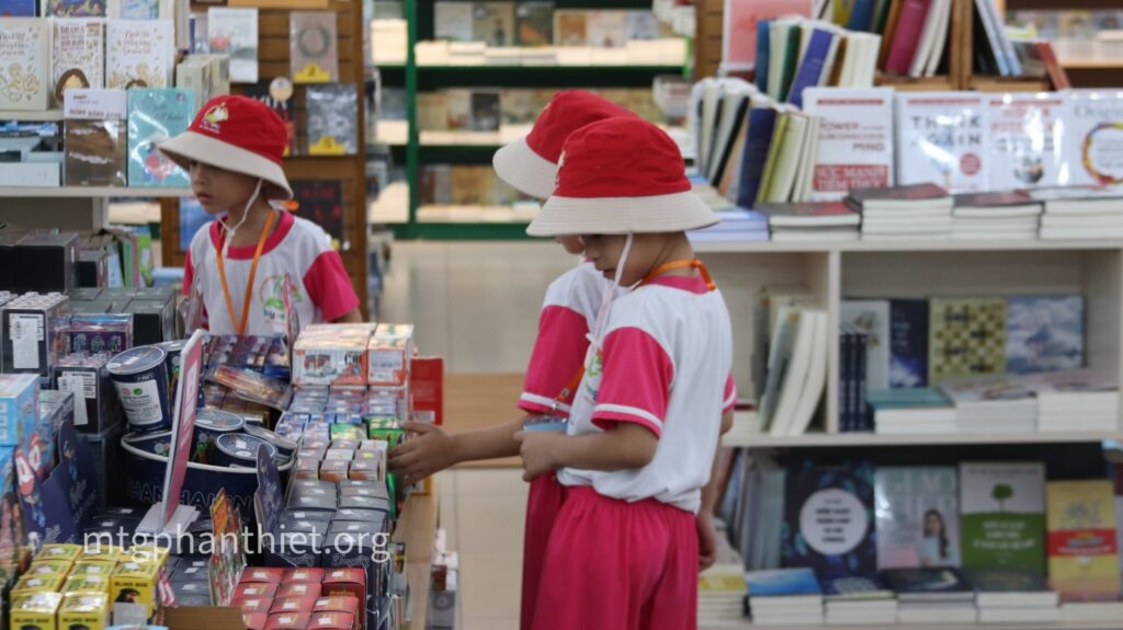 Tại siêu thị Co.opmart La Gi, các bé lớp Lá Trường Mầm Non Hy Vọng – thuộc Cộng đoàn Tân Lập Hội dòng Mến Thánh Giá Phan Thiết – được chia nhóm để lần lượt tham quan nhà sách, quầy hàng, những kệ đồ quen thuộc trong đời sống hằng ngày. Trước đó, các cô đã cùng các em ngồi lại, trò chuyện xem “hôm nay con muốn mua gì?”. Có bé hào hứng nói muốn mua bánh, mua đồ chơi, mua bút màu, có bé lại bảo thích mua xì dầu vì rất mê ăn xì dầu với cơm… Những dự định nhỏ bé ấy đều được lắng nghe và trân trọng.